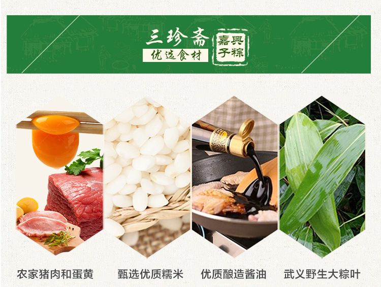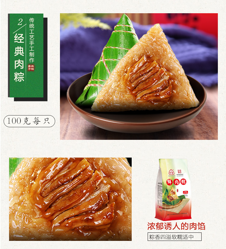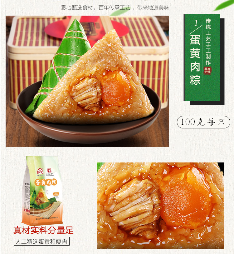 嘉兴粽子三珍斋蛋黄肉粽甜粽100g*2只袋装新鲜手工粽子